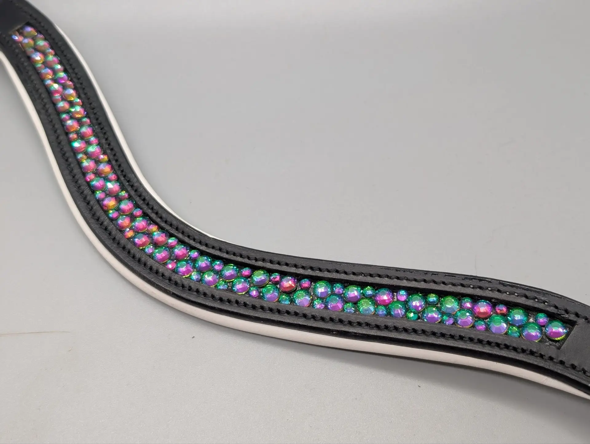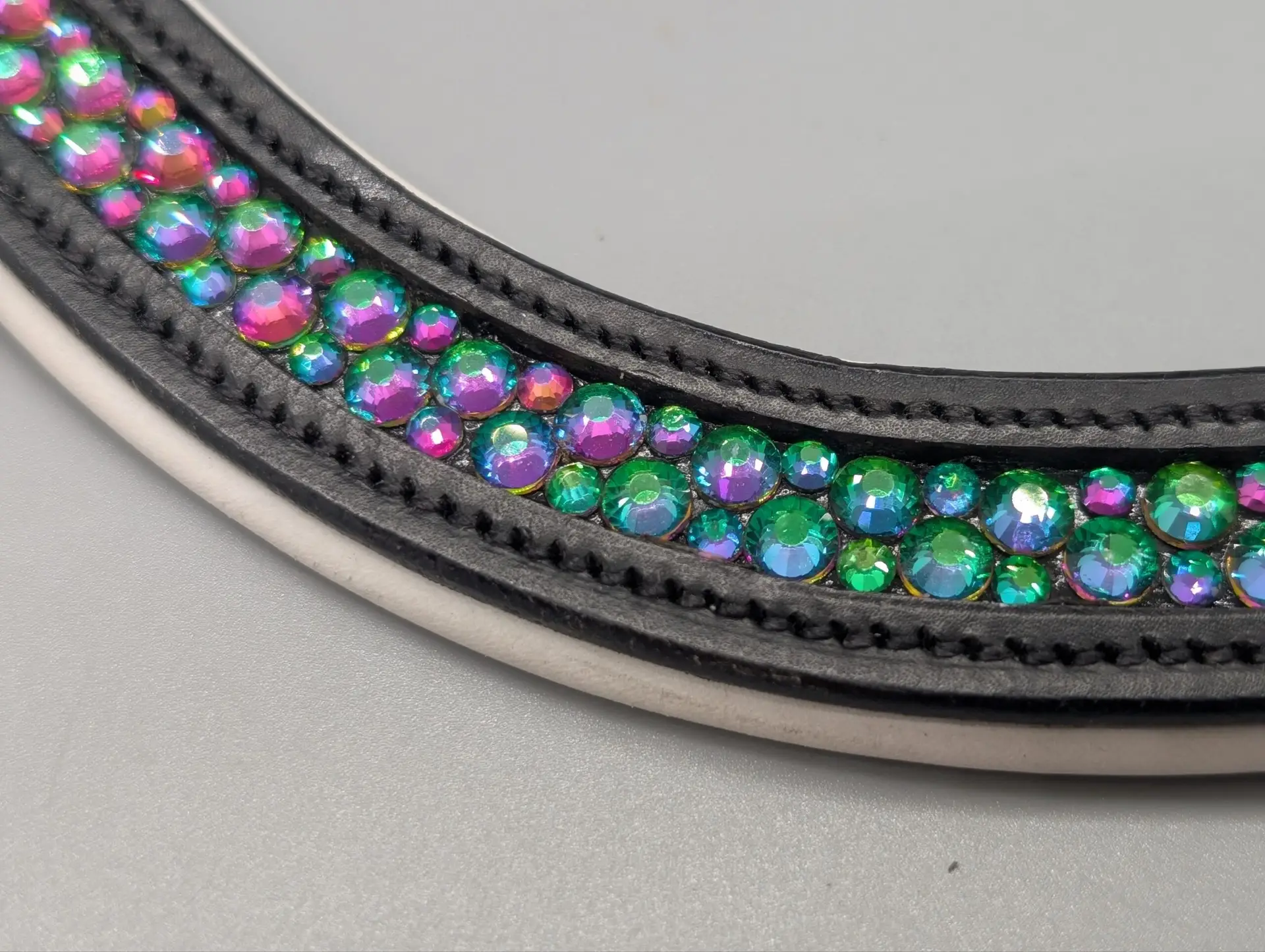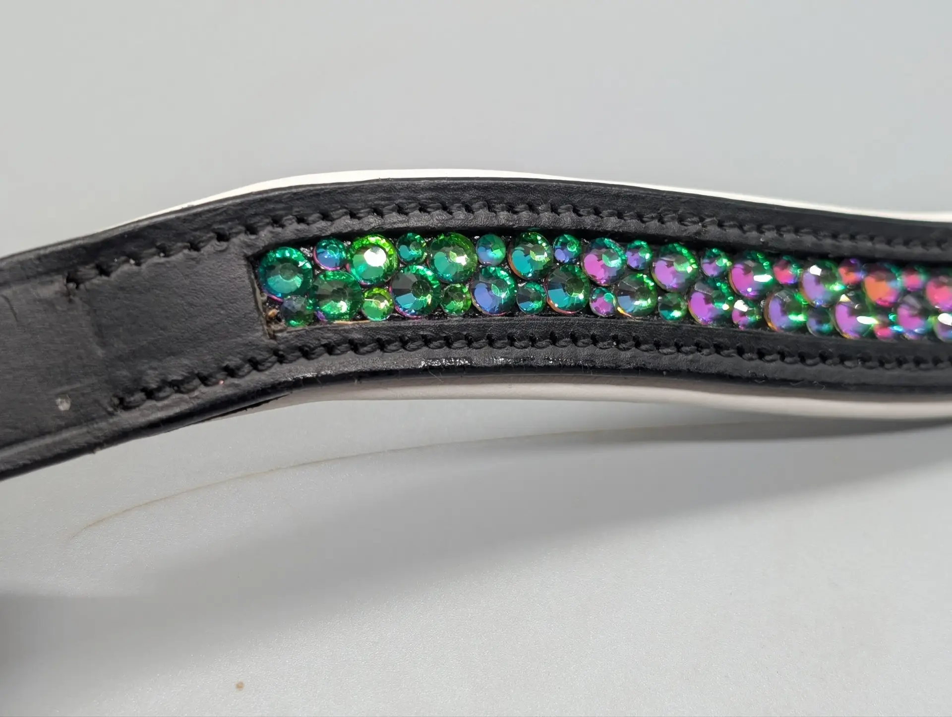 Pandebånd med grønne heliotrop rhinsten, der chancerer fra grøn til lilla alt afhængigt af hvor fra man ser dem.